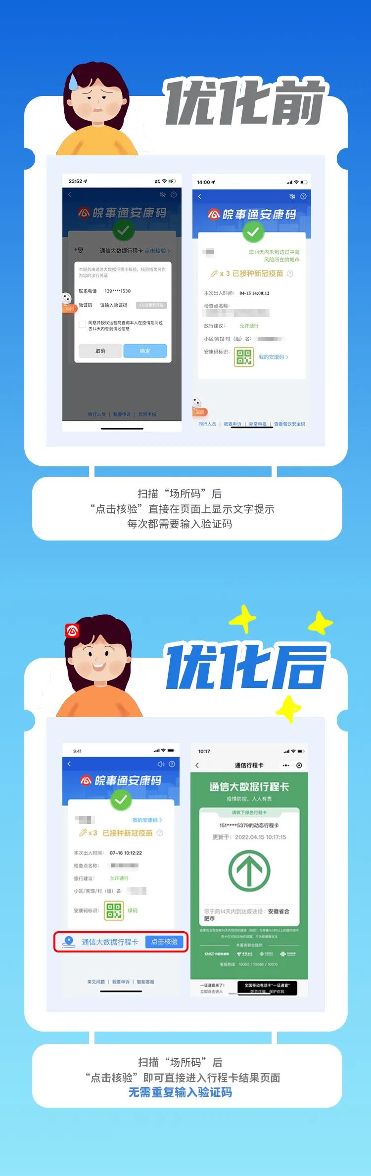 此次优化升级有两大亮点:一是通过安康码页面可以直接核验通信大数据行程卡,并显示前14天内曾到访城市、是否带星号等详细信息;二是核验行程码时无需重复输入验证码。